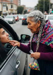 Ang kanyang kulubot at mga kamay na may bahid ng araw ay may hawak na isang transparent na bag na puno ng mga kulay na palette, mint gum, Charles V chocolates, at maluwag na sigarilyo. Dahan-dahan siyang naglakad, pagod na mga hakbang, at iniaalay ang kanyang mga kalakal sa bawat driver na may mahiyaing ngiti.