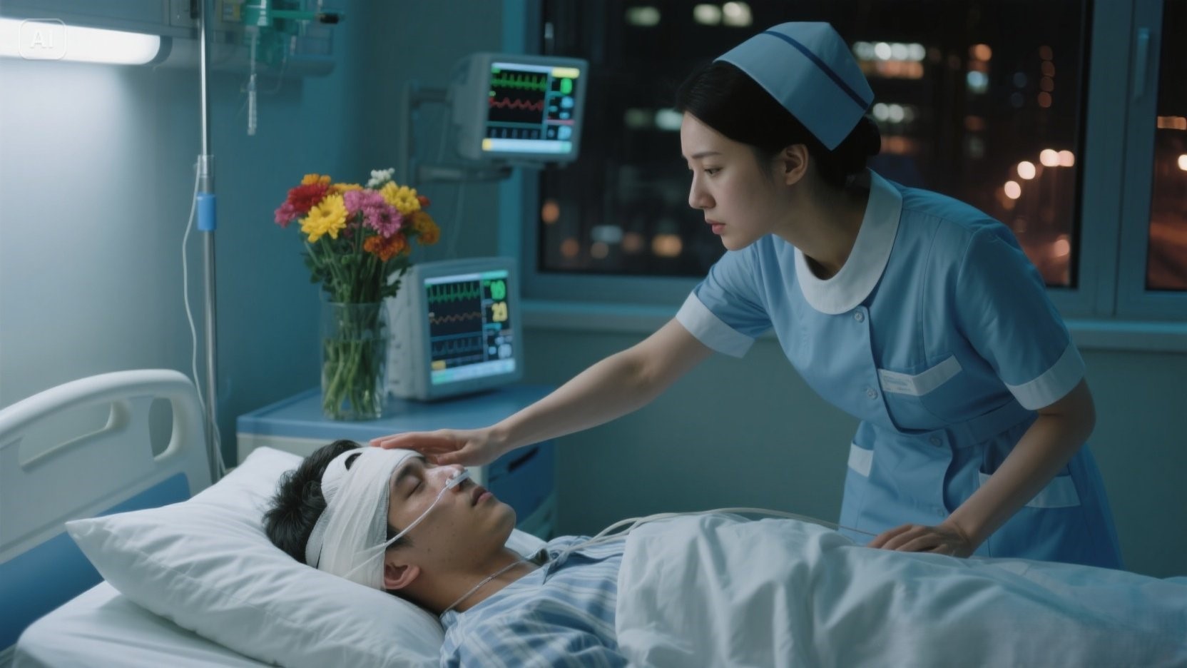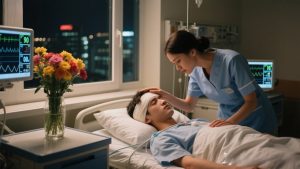 Nang gabing iyon, si Ananya ay nasa night duty. Isang madilim na dilaw na ilaw lang ang naroon sa hallway. Pumasok siya sa kuwarto, umupo sa tabi ng kama, at tahimik na pinalitan ang IV. Biglang pumasok sa kanyang isipan ang isang kakaibang kaisipan: “Hindi siya magising… Isang halik… Ano ang problema…”