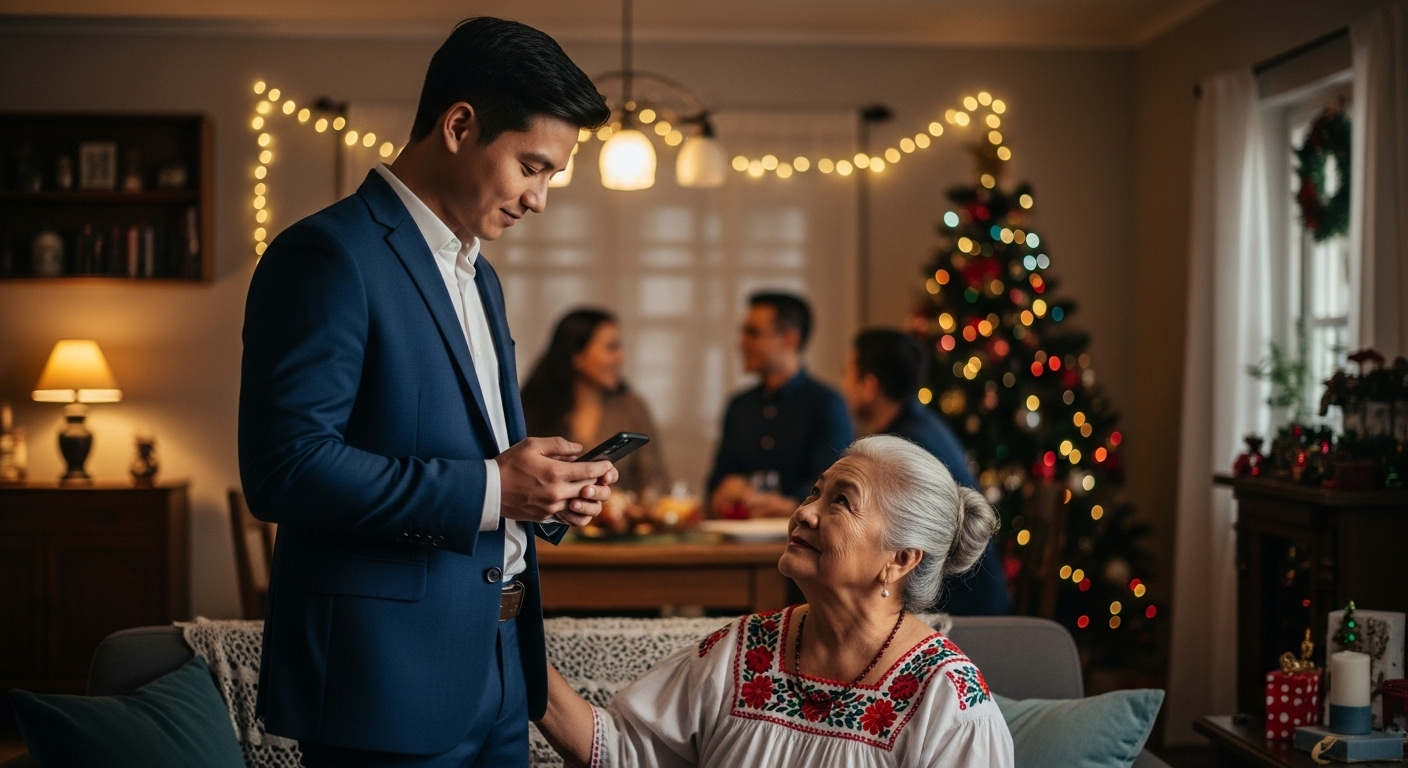 Sa kabilang dako, naroon si Carlo,ang kanyang pamangkin, isang abogadong nasa kanyang 30s. Siya ay nakasuot ng business casual, na tila galing sa isang mahalagang pagpupulong, may maayos na tindig, atmadalas ay malalim ang iniisip, paminsan-minsan ay may pag-aalala sa kanyang mukha. Mas sanay si Carlo sa direktang pag-uusap sa kanyang propesyon, ngunit sa loob ng mga pader ng tahanang ito, alam niyang ang mga patakaran ng komunikasyon ay iba.