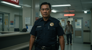 Mula sa kanyang istasyon sa tabi ng entrance, si Security Officer Mang Tonyo, humigit-kumulang 50s, ay naunahan na si Aling Nena sa pagmamasid. Si Mang Tonyo ay isang matatag at kalmadong security officer na may malawak na karanasan. Nakasuot siya ng kanyang uniporme, ang kanyang matipunong pangangatawan ay nagpapahiwatig ng kanyang pagiging alerto. Ang kanyang mga mata ay nakatuon sa bagong dating, agad niyang sinusuri ang posibleng banta. Hindi niya binabalewala ang anumang kakaibang paggalaw, dahil alam niya na sa isang ospital, ang bawat segundo ay mahalaga.