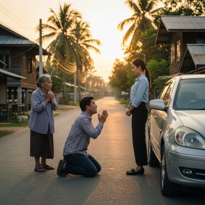 Lan froze, her heart tightening. The sight of the old man kneeling stirred the memory of that night—his silence as she was cast out. Tears welled up. Bin blinked in confusion: “Mom, why is Grandpa kneeling?” His innocent question softened her heart.