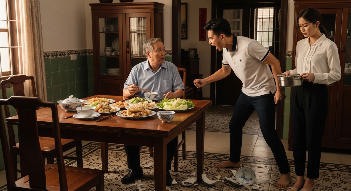 Lan froze, unable to explain. Before she could utter a word, he snatched the container from her hands. Plates clattered and shattered on the table. Their son watched in shock, while Lan trembled, her eyes brimming with tears.