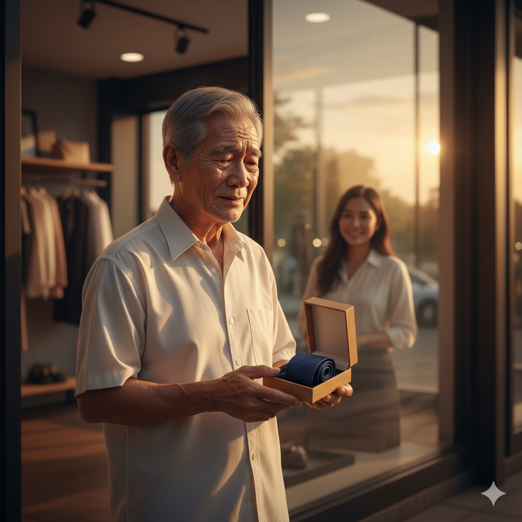 Habang dahan-dahan siyang naglalakad sa loob ng boutique, pinagmamasdan niya ang mga kurbata—may mga kulay asul na elegante, may disenyo ng tuldok, at may mga tatak na alam niyang hindi niya kayang bilhin.